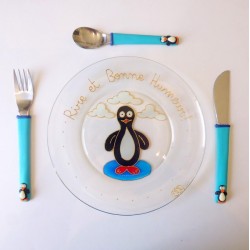"Rire et Bonne humeur" est le thême de ce coffret Pingouin! Les enfants passeront à table avec bonne humeur avec cette petite vaisselle adaptée à leur taille. Prénom offert sur les couverts.